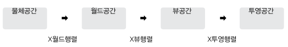 - 투영공간: 이동,회전,확대.축소 한 물체들을 2D이미지 위에 투영하는 것.(직각투시법 또는 원근투시법 등등을 적용가능)