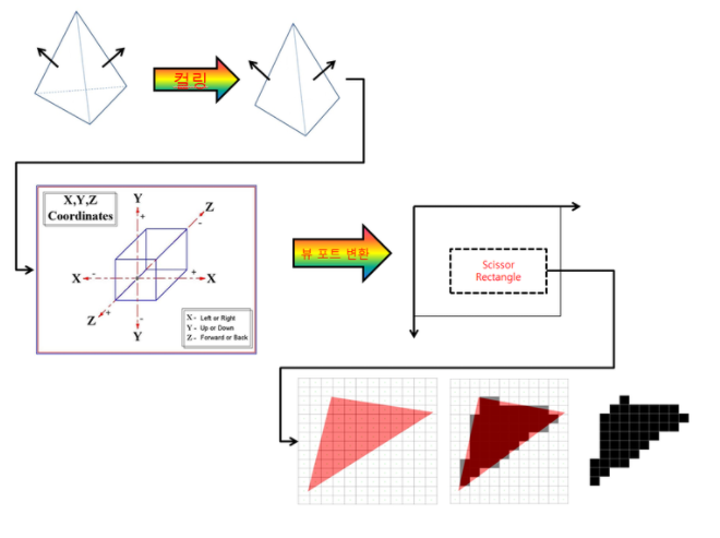 - 보이지 않는 primitive 제거(은면 제거, 컬링 처리)