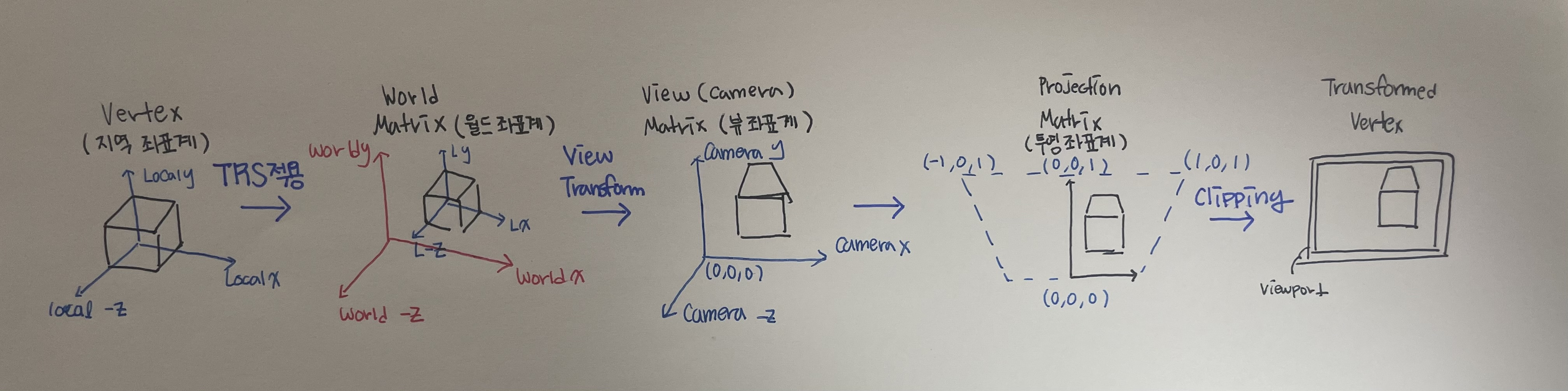 View Matrix- 카메라를 원점 기준으로 맞춰주면서 월드 좌표에 있는 사물을 그에 맞게 이동하는 작업이다.