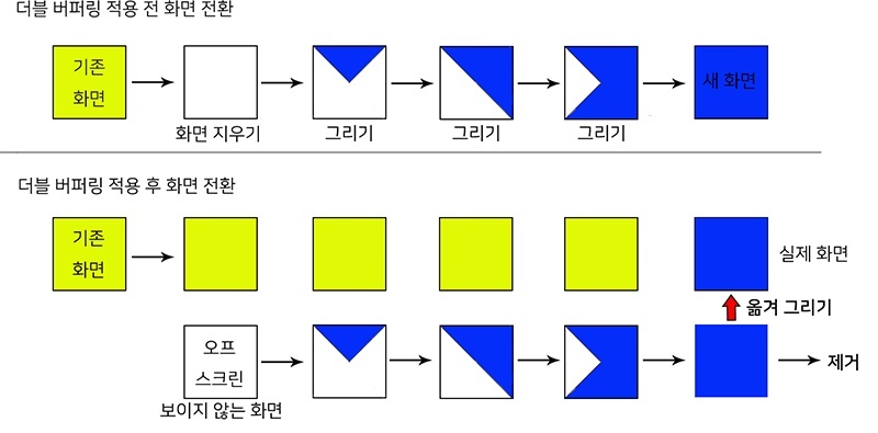 - 새로운 이미지가 생성되면 백 버퍼와 스왑하여 화면의 깜빡임이 없도록 한다.