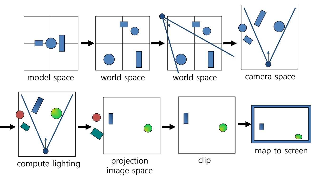📑 전공과목 교수님의 개별적인 튜토리얼 스크립트를 바탕으로 작성되었습니다.😊 The Geometry Pipeline 3D->2D로 변환이 되는 과정에서는 수학적 절차가 존재한다. 1. World Transformation : 생성되는 모