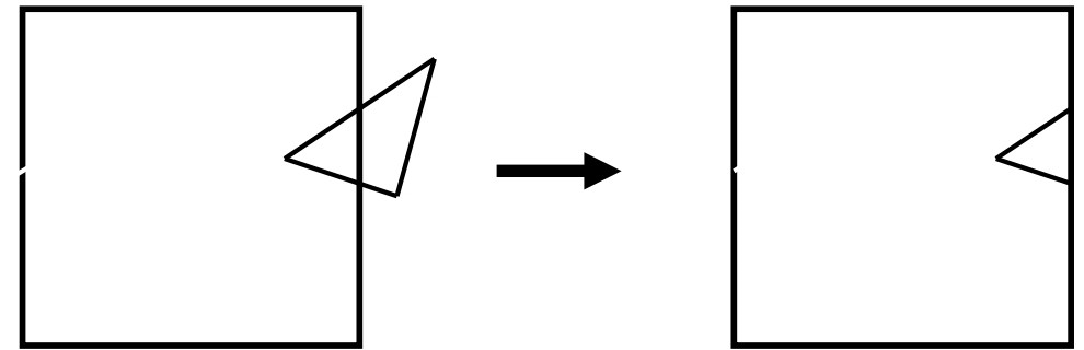 절두체 정의에 의해 경계에 걸쳐진 폴리곤들을 잘라내어, 절두체 외부 영역을 버리는 단계.