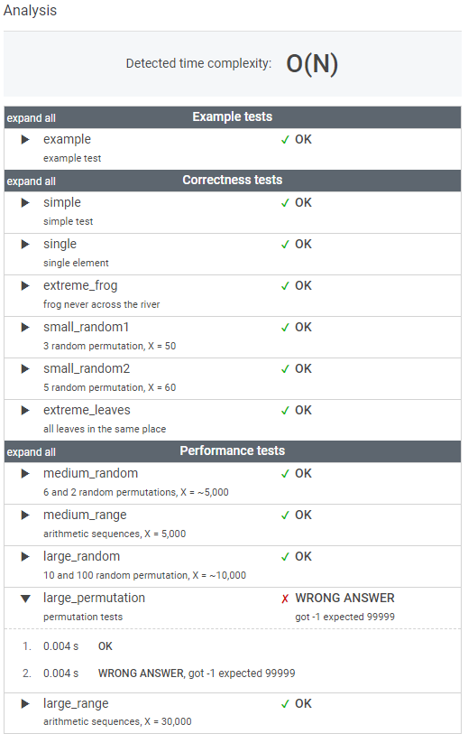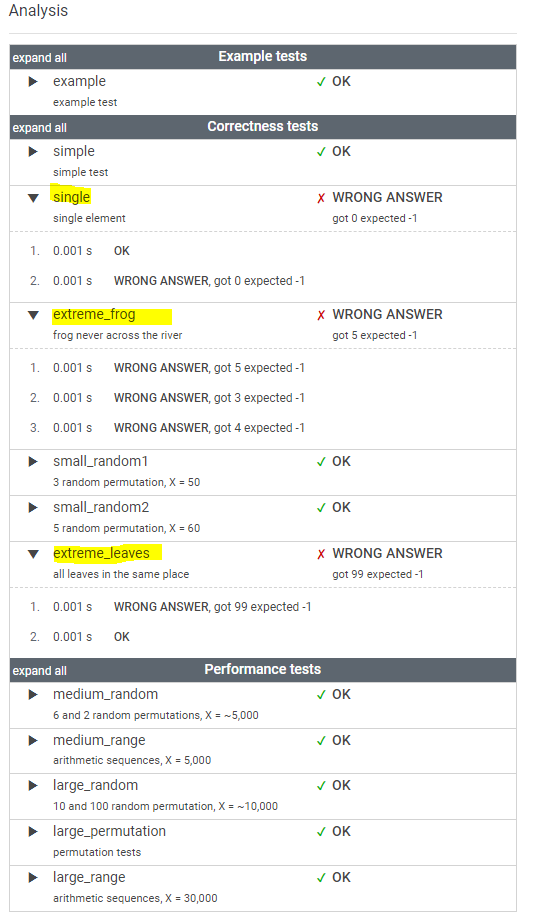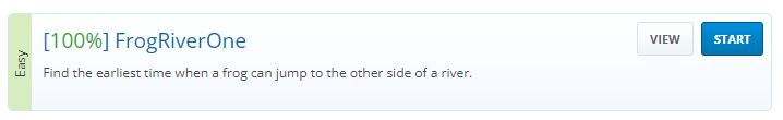 The goal is to find the earliest time when the frog can jump to the other side of the river. The frog can cross only when leaves appear at every position across the river from 1 to X (that is, we want to find the earliest moment when all the positions from 1 to X are covered by leaves). You may assume that the speed of the current in the river is negligibly small, i.e. the leaves do not change their positions once they fall in the river.